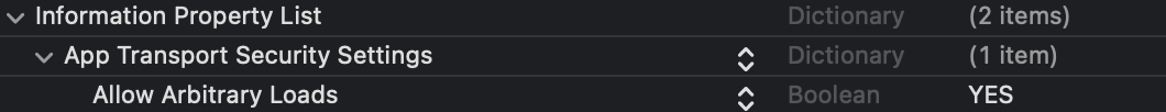 NSIncluedsSubdomains 과 NSExceptionAllowsInsecureHTTPLoads를 추가 해준다.