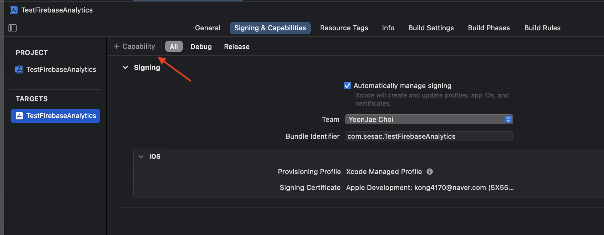 TARGETS -> Signing & Caplabilities > + Capability 를 선택 해줍니다.
