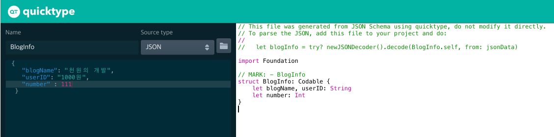 - JSON 데이터를 입력하면 모델 구조를 만들어 주는 사이트