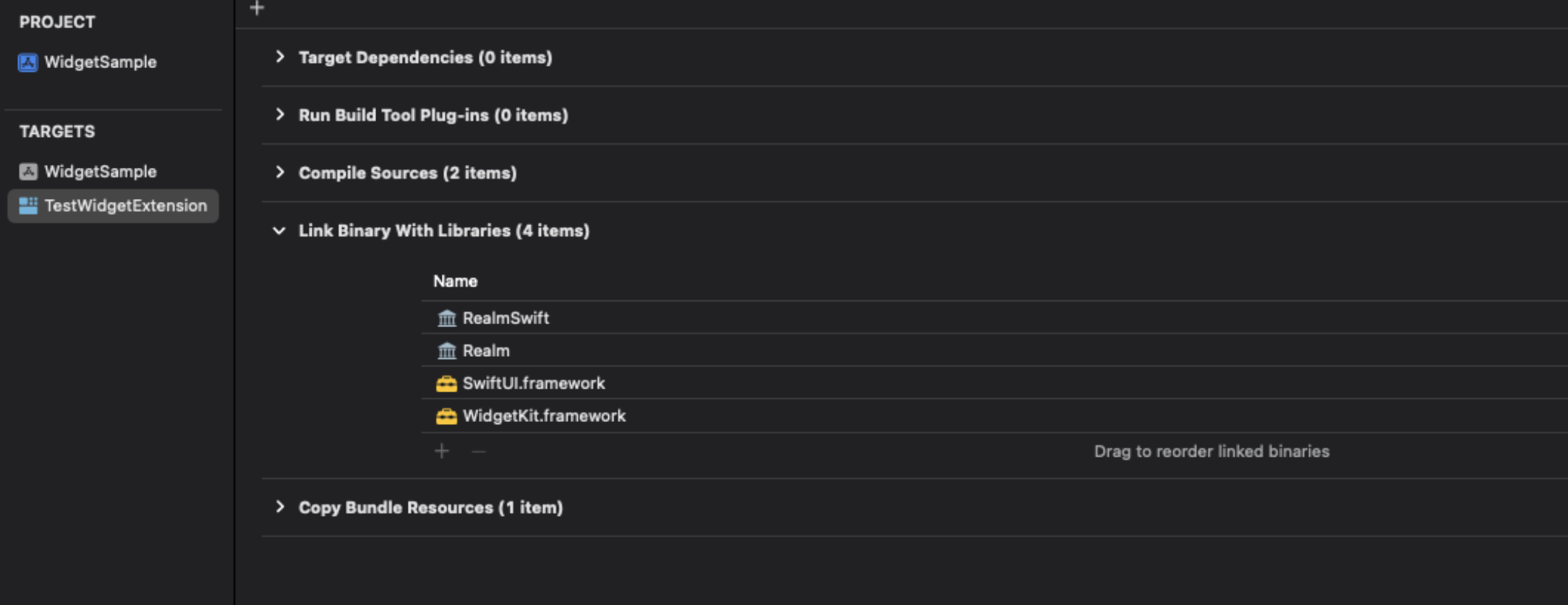 반면에 위젯의 Build Phases를 확인해 보면 Realm이 없는것을 확인할 수 있습니다.
