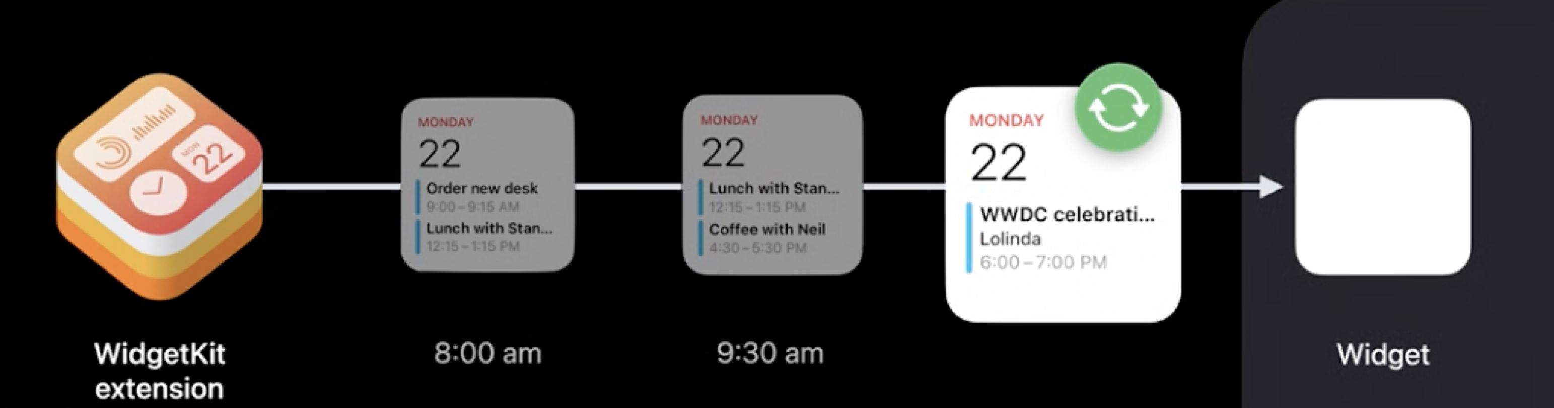 우리가 업데이트시키고 싶은 시간을 위젯에 미리 알려주어서 위젯이 미리 그 시간의 화면을 구성해 두었다가 변경하는 방식으로 동작합니다. 예제를 보시면 9시 -> 9시 30분 -> 10시 5분에 위젯을 업데이트해달라고 요청하면 위젯은 미리 뷰를 만들어 두었다가 그 시간에 맞추어서 업데이트해 주는 방식입니다.