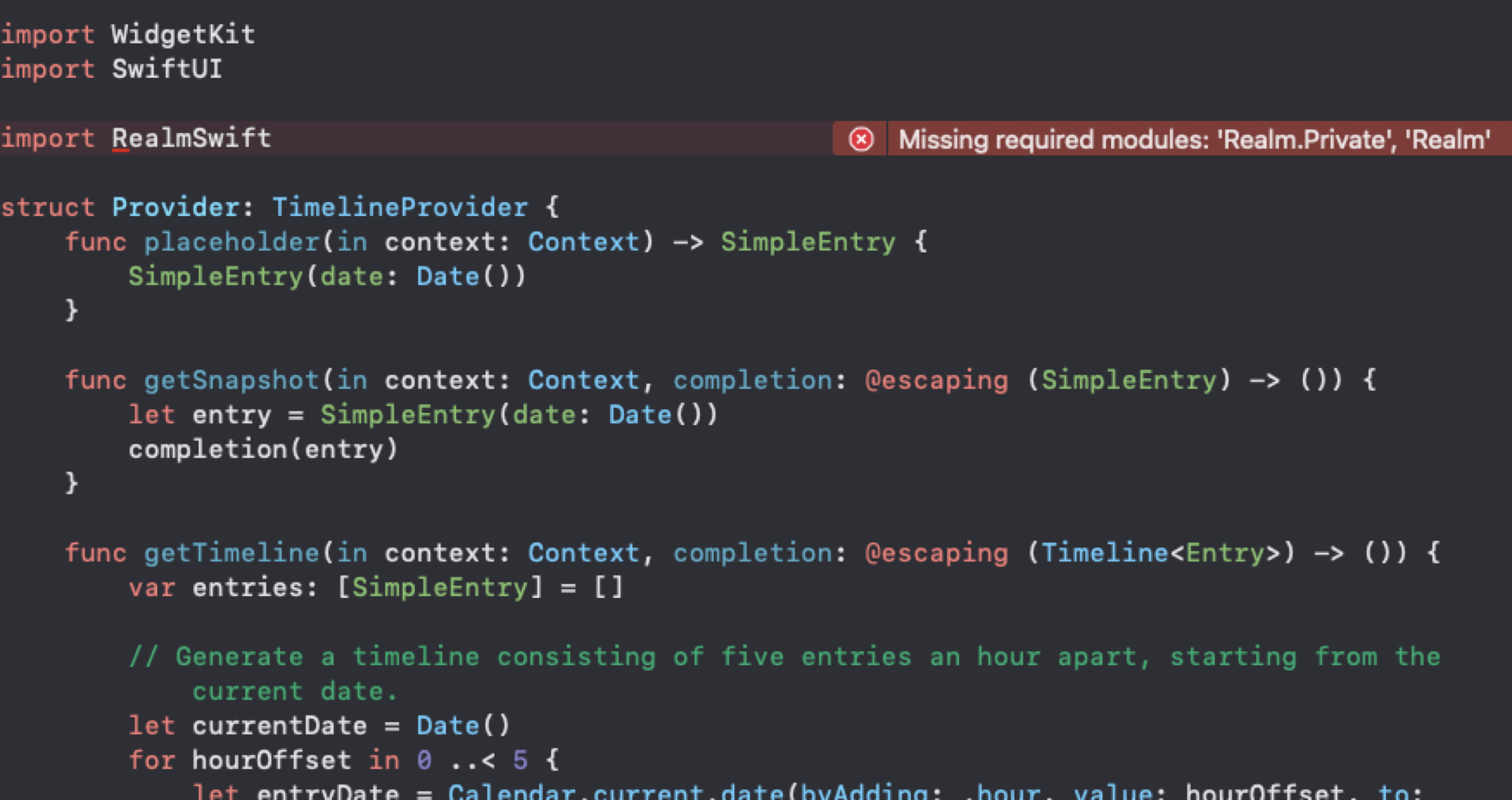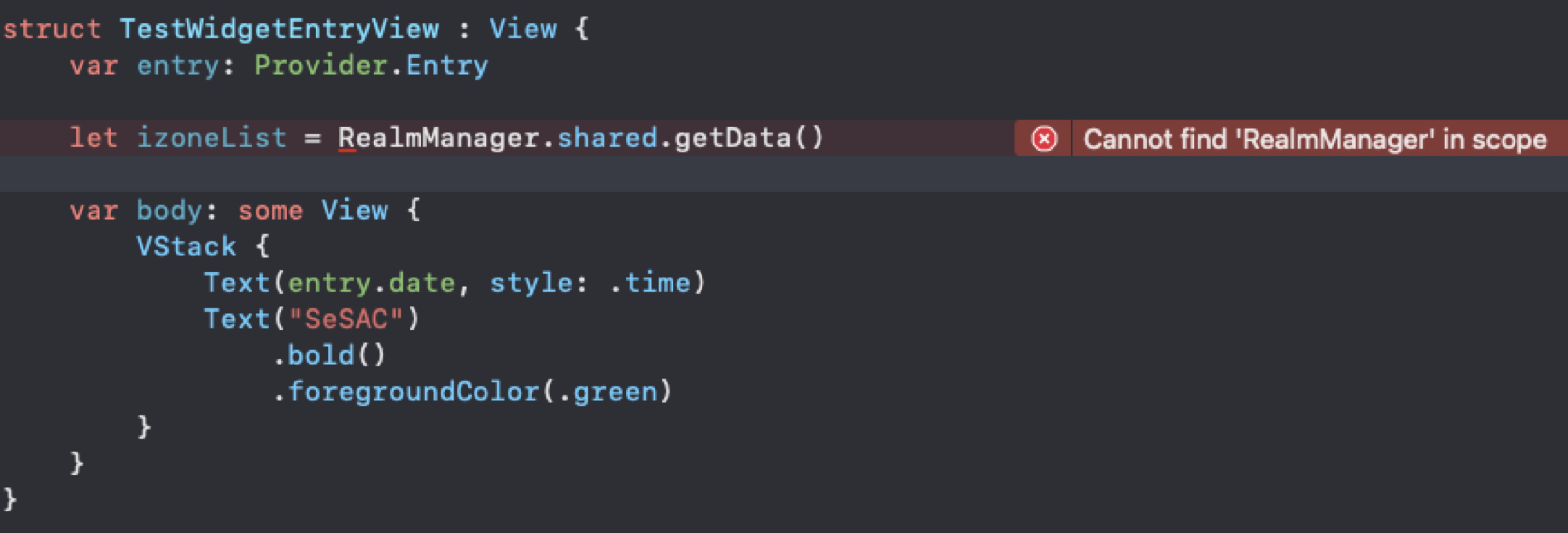 위젯을 구성하는 TestWidgetEntryView에서 RealmManager를 호출하면 다시 한번 런타임 오류를 만나게 됩니다.