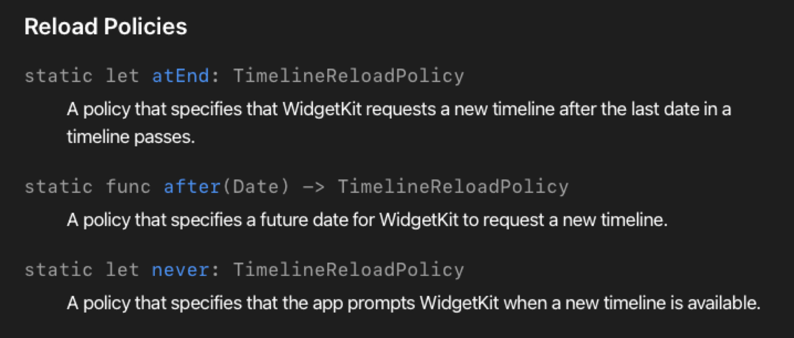 timelineReloadPolicy에는 총 3개가 있는데 atEnd는 타임라인의 마지막 시간이 지난 후 그러니까 우리 입장에서는 11시가 지난 후 Widgetkit이 새 태임라인을 요청하도록 합니다. 그러면 이제 11시를 기준으로 다시 총 1시간씩 5개가 생성이 되는거죠