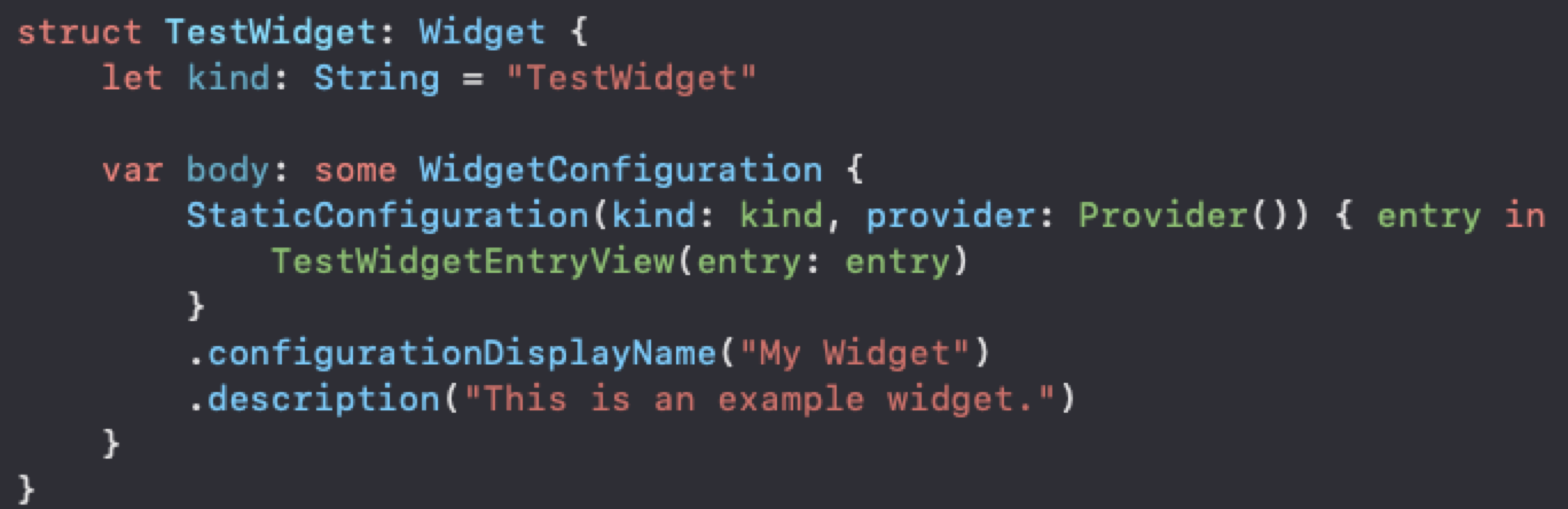 마지막으로 클로저 안에는 위젯을 렌더링하기 위한 SwfitUI View가 포함되어있습니다. <- 이게 무슨 소리인가 하면 testWidgetEntryView를 한번 살펴보겠습니다.