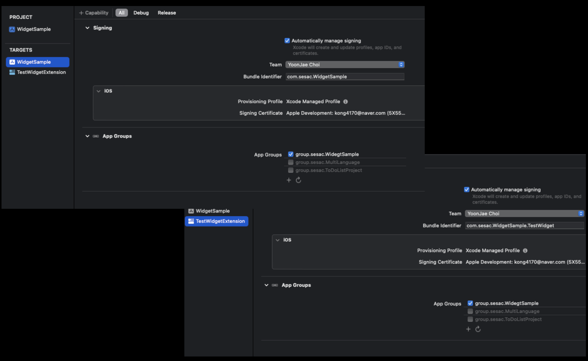 위젯과 app target에 각각 AppGroup을 추가해준 모습입니다.