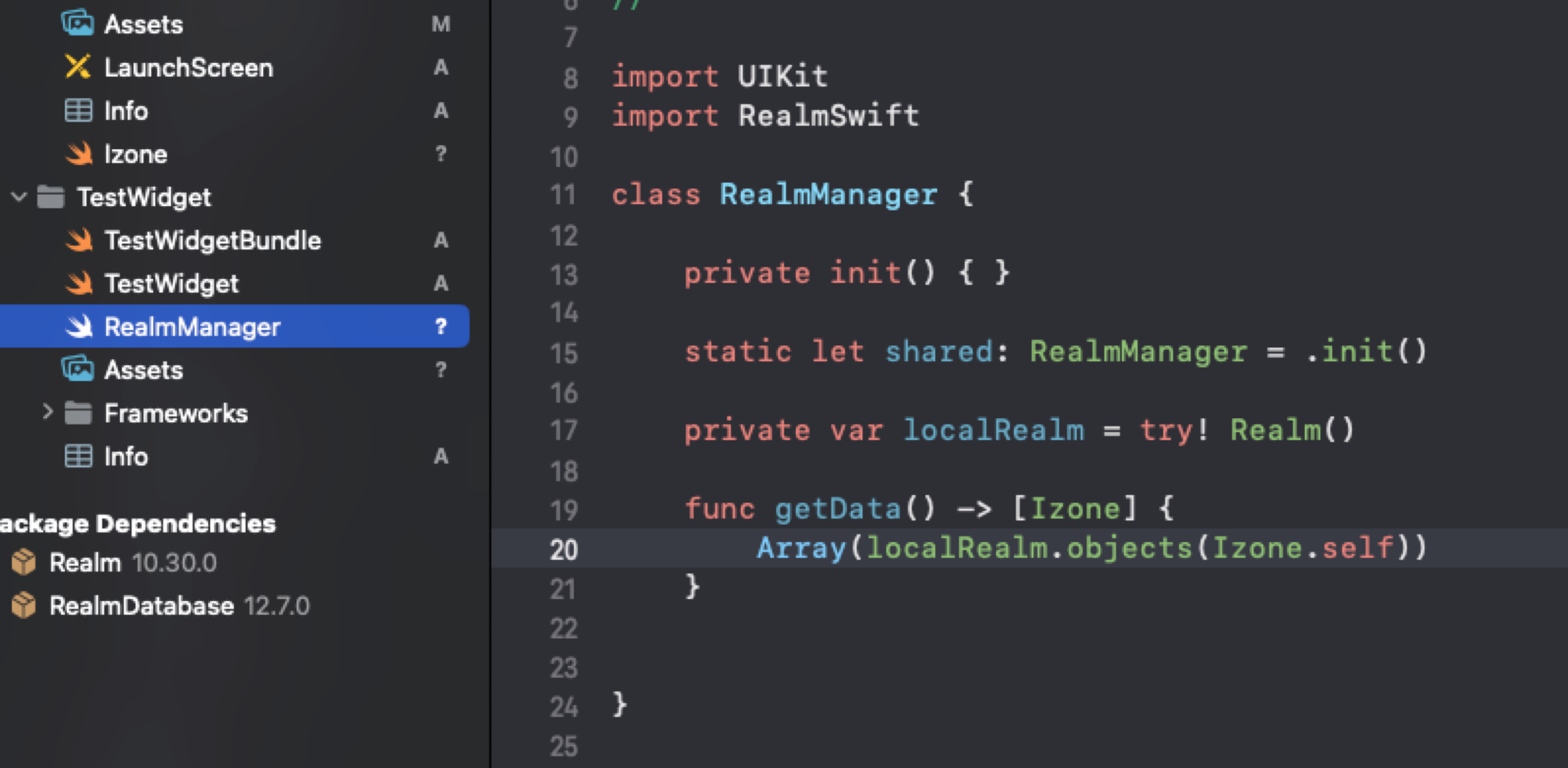 이제 다음으로 Realm 데이터를 가져오기 위해서 싱글턴 형태의 RealmManager를 만들어서 아이즈원의 데이터를 getData메서드를 통해서 한번 가져와 보겠습니다.