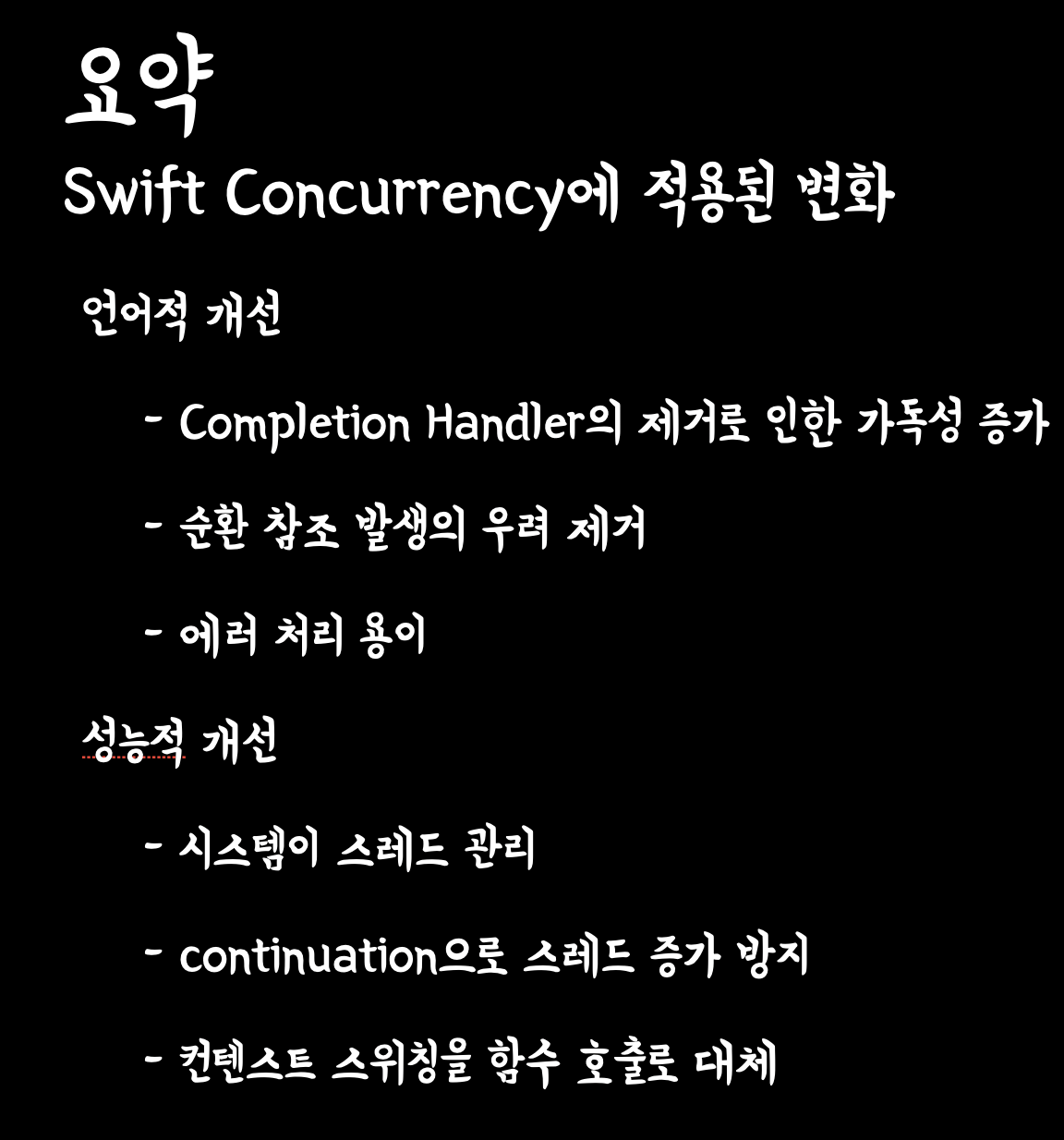 이런 부분들을 개선하고자 Swift 5.5 이후에 나온 것이 async-await 문법입니다.