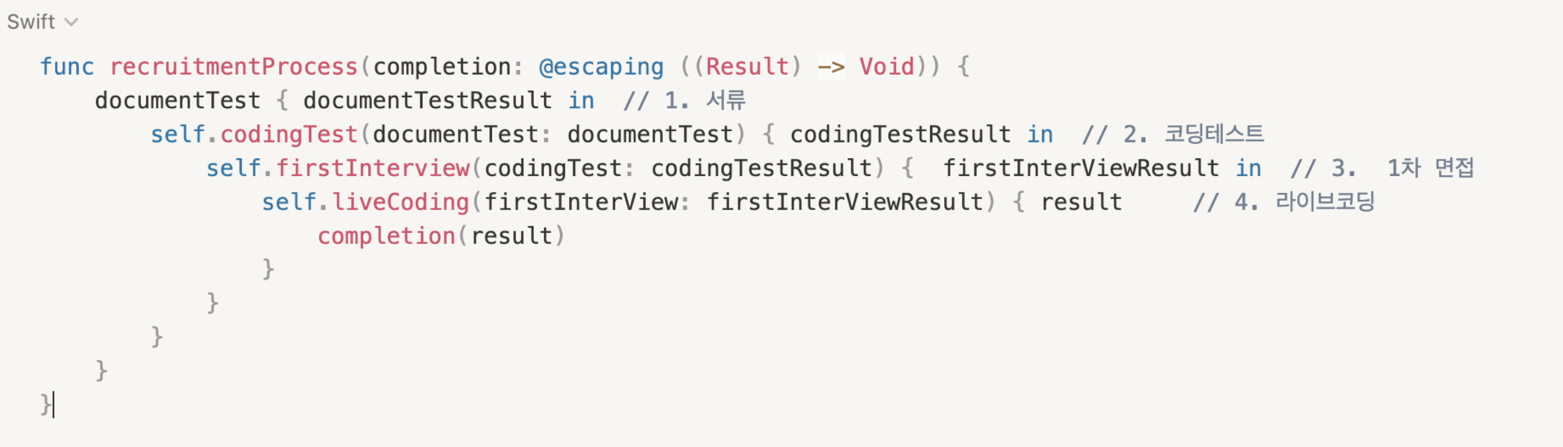 위의 코드는 채용프로세스에 관혀여 비동기 코드를 GCD와 CompletionHandler를 사용하여 작성한 코드입니다. 서류시험, 코딩테스트, 1차 면접, 라이브코딩 순으로 코드가 동작하는 모습입니다.