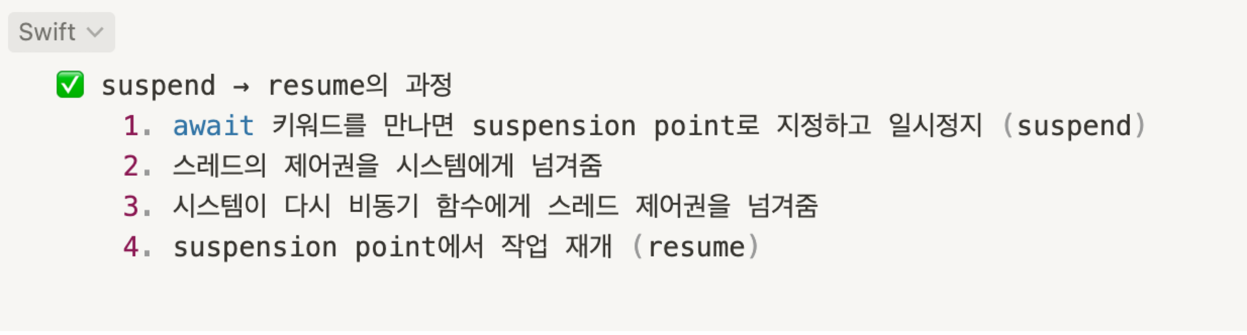 Suspend와 Resume의 과정을 보면 await 키워드를 만나면 Suspension point로 지정 후 일시 정지하고 스레드의 제어권을 시스템에게 넘겨줍니다. task가 재개되는 시점에서 시스템이 다시 적절한 스레드로 제어권을 넘겨주어 task가 재개되게 됩니다. 이렇게 되면 함수가 일시정지 되는 과정에서 추가적인 스레드의 생성 없이 적절한 스레드로 task가 배정되게 됩니다. 그렇다면 왜 추가적인 스레드의 생성 없이 실행할 수 있을까요? 다음으로 한번 알아보겠습니다.