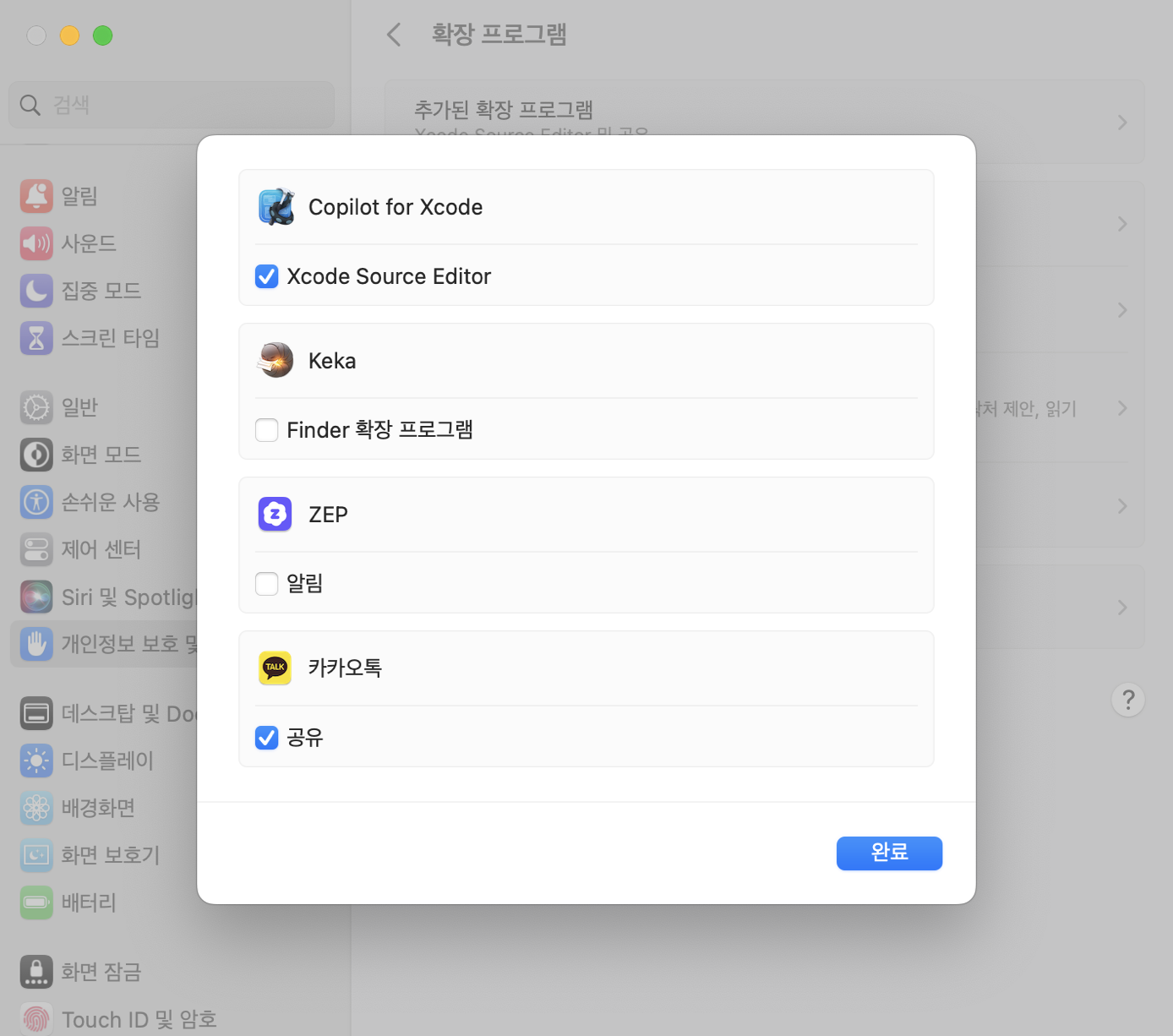 개인정보 보호 및 보안 > 확장 프로그램 > Xcode Source Editor > Copilot 체크
