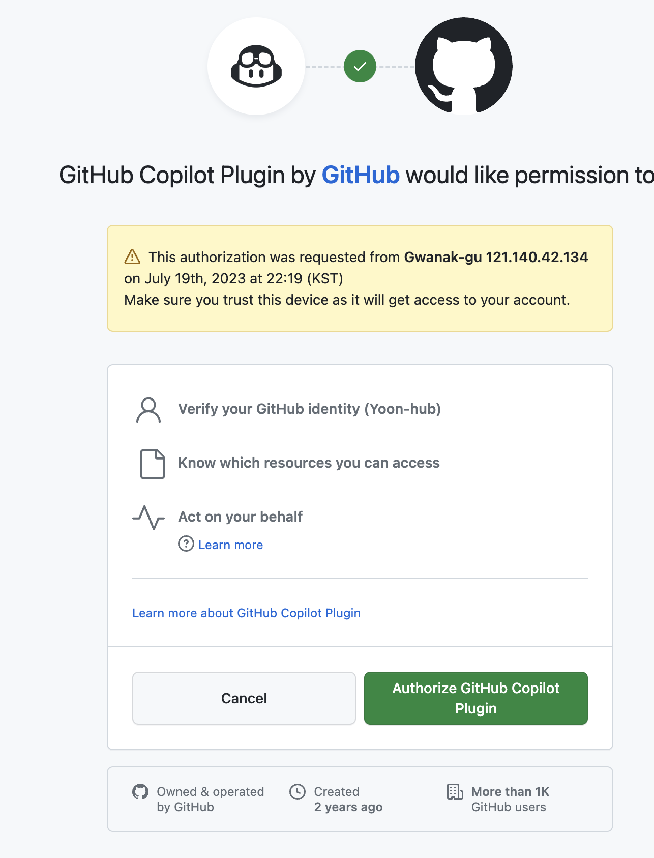 복사된 인증 번호를 입력하면 Github와 연동이 완료되고 프로그램에서 Confirm Sign-in 버튼을 눌러주면 Xcode에서 Copilot 사용 준비가 완료되었습니다.