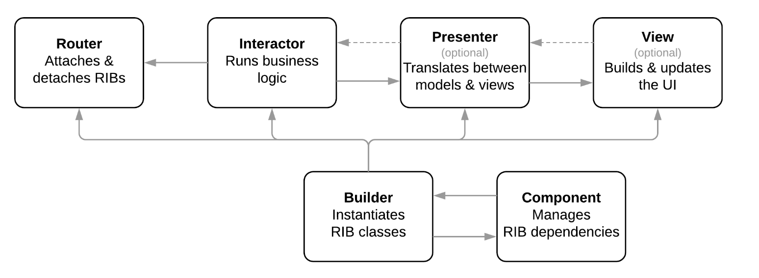 - Interactor가 구현하는 단순하고 반복적인 라우팅 논리가 포함되어 있습니다. 이 코드를 제외하면 Interactor를 작게 유지하고 RIB에서 제공하는 핵심 비즈니스 로직에 집중이 가능합니다.