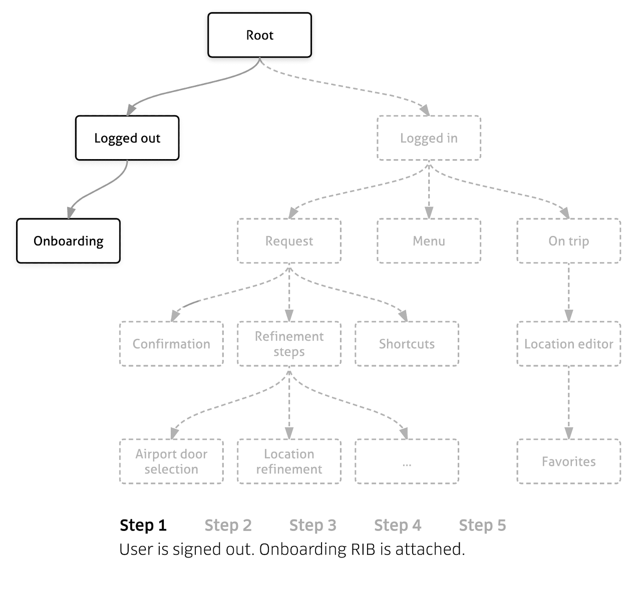 현재 RIB 트리에 연결된 RIB에 의해 관리되고 표시됩니다. 예를 들어 사용자가 승차 공유 앱에서 여러 상태를 진행함에 따라 앱은 다음 RIB을 연결 및 분리합니다.