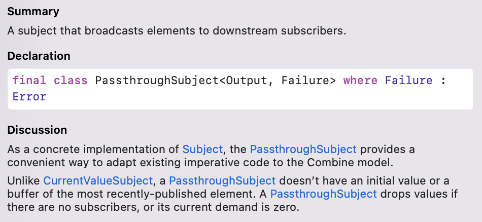 두개의 Subject를 비교하면서 설명 드리자면 CurrentValueSubject는 버퍼를 사용해서 현재 값을 가지고 있고, PassthroughSubject는 이름 처럼 그냥 가지지 않고 스쳐지나가는 형태로 값을 관리합니다. 덕분에 CurrentValueSubject를 사용하면 초기값을 생성해 주어야 하고 사용하다가 현재 값을 가져오고 싶으면 value를 통해서 접근이 가능합니다.