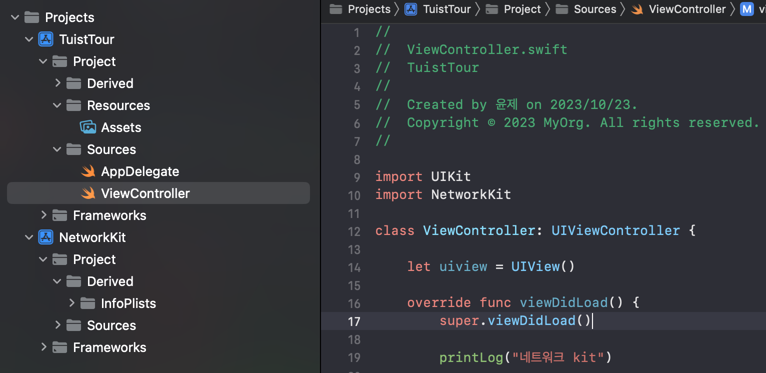 이제 fetch generate 해주면 Tuist 폴더가 추적이 되고 Alamofire를 정상적으로 NetworkKit에서 import 할 수 있습니다. Tuist는 특이하게 패키지를 사용하는 것이 아닌 sub Project를 만들어 framework형태로 라이브러리를 의존하게 만든다고 합니다.