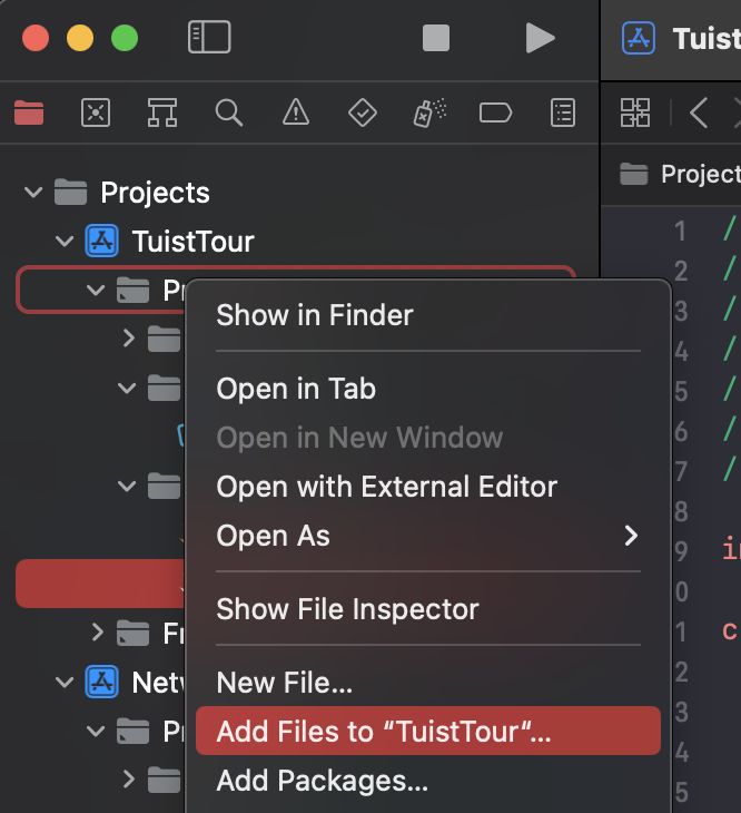 먼저 Tuist edit 해준후 Tuist 폴더 내부에 Dependencies 파일을 생성해 줍니다. 그런 다음 저는 Alamofire를 설치해 주는 코드를 작성해 주겠습니다.