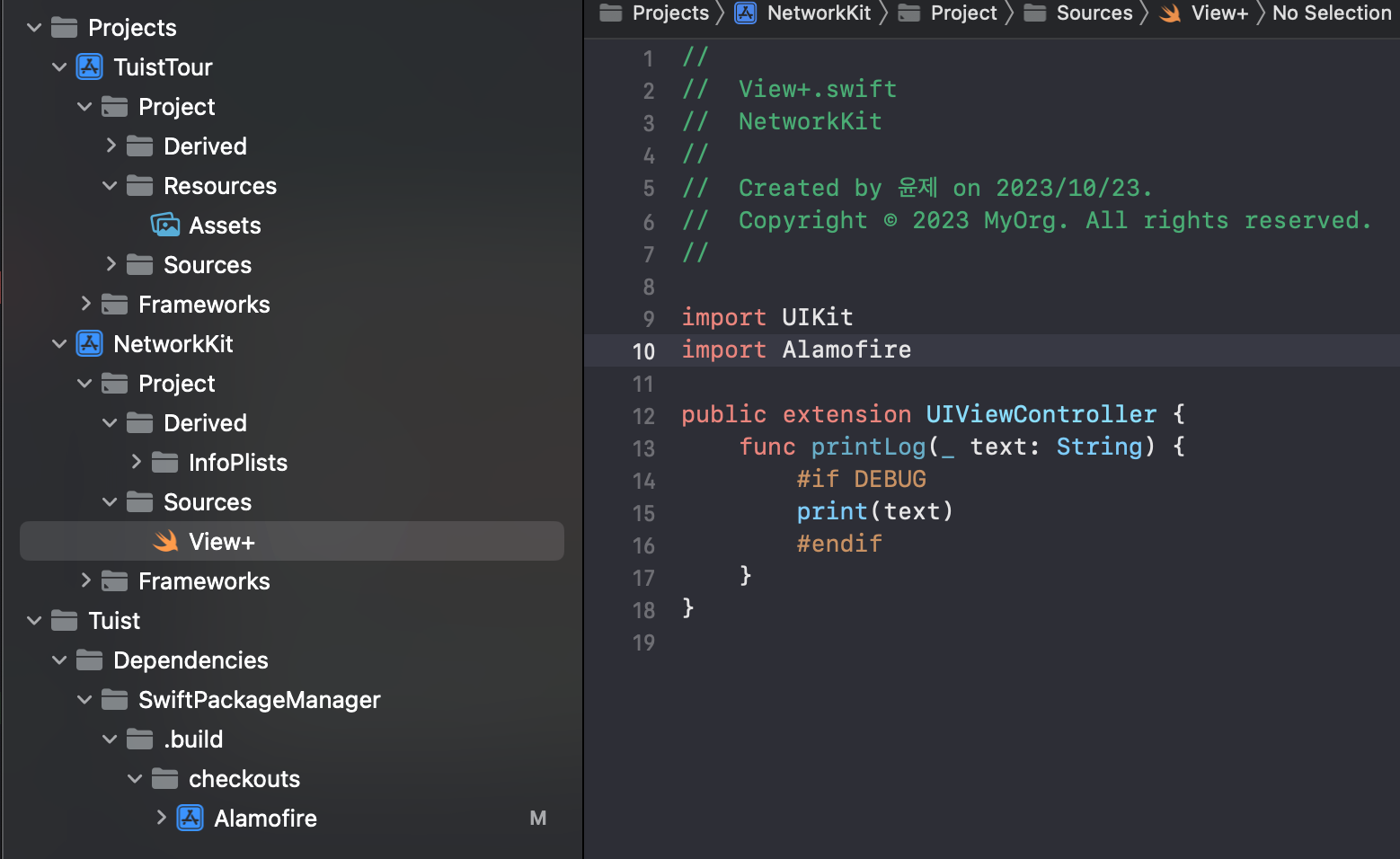 이제 fetch generate 해주면 Tuist 폴더가 추적이 되고 Alamofire를 정상적으로 NetworkKit에서 import 할 수 있습니다. Tuist는 특이하게 패키지를 사용하는 것이 아닌 sub Project를 만들어 framework형태로 라이브러리를 의존하게 만든다고 합니다.