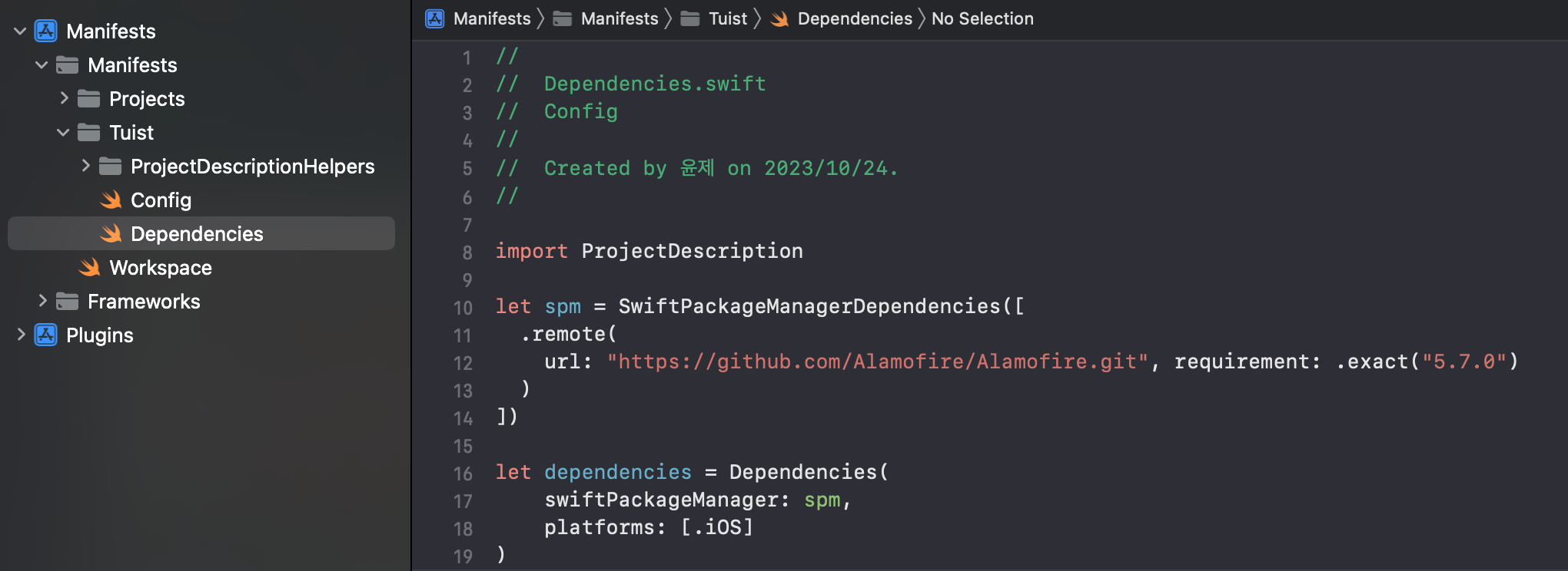 먼저 Tuist edit 해준후 Tuist 폴더 내부에 Dependencies 파일을 생성해 줍니다. 그런 다음 저는 Alamofire를 설치해 주는 코드를 작성해 주겠습니다.