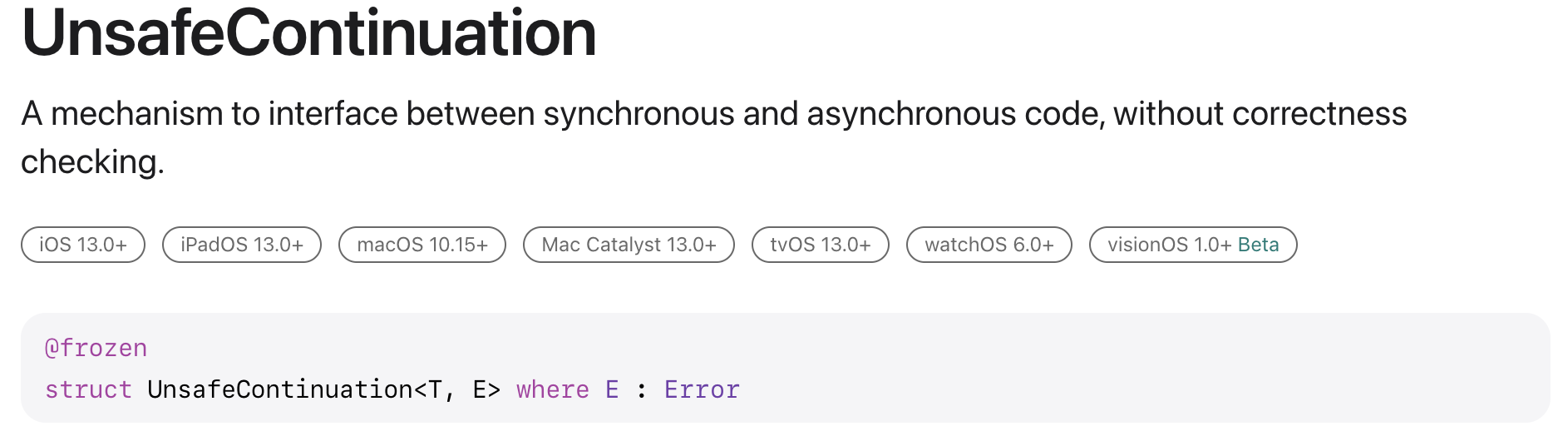 공식 문서를 보면 CheckedContiuation과 UnsafeContination 두 종류가 있는데 한번 확인해 보겠습니다.