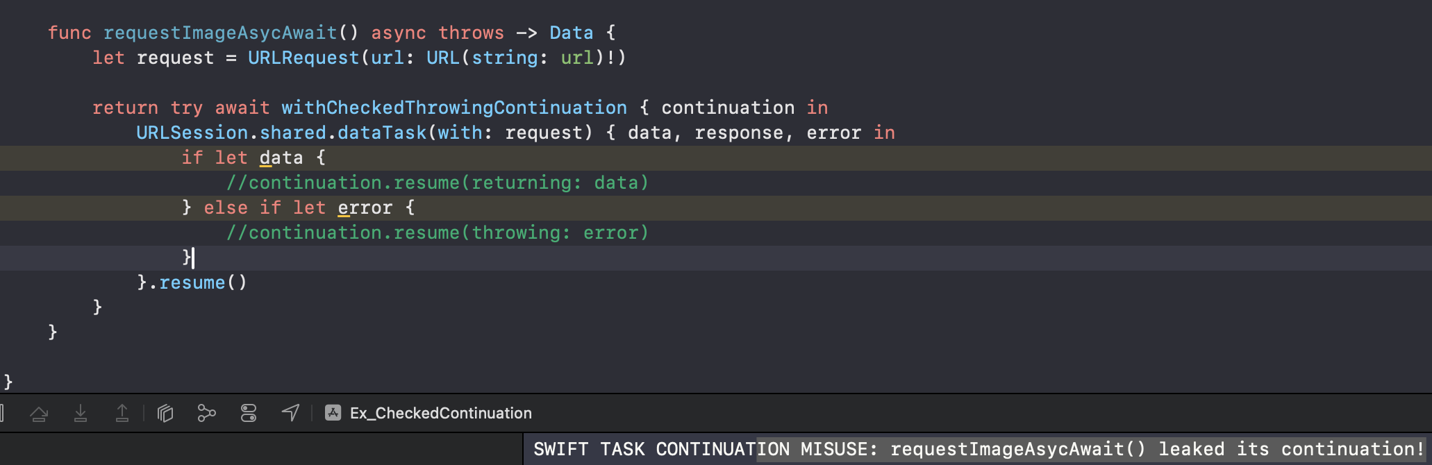 다음으로 UnsafeContinuation을 간단하게 보자면 CheckedContiuation이랑 사용법은 완전히 동일하지만 Continuation을 사용할 때는 resume을 호출하지 않으면 코드가 영원히 await 상태에 머물게 되고 이는 리소스 낭비로 이어지게 되는데, CheckedContiuation을 사용하면 콘솔창에 명시적으로 leaked되고 있음을 알려주지만