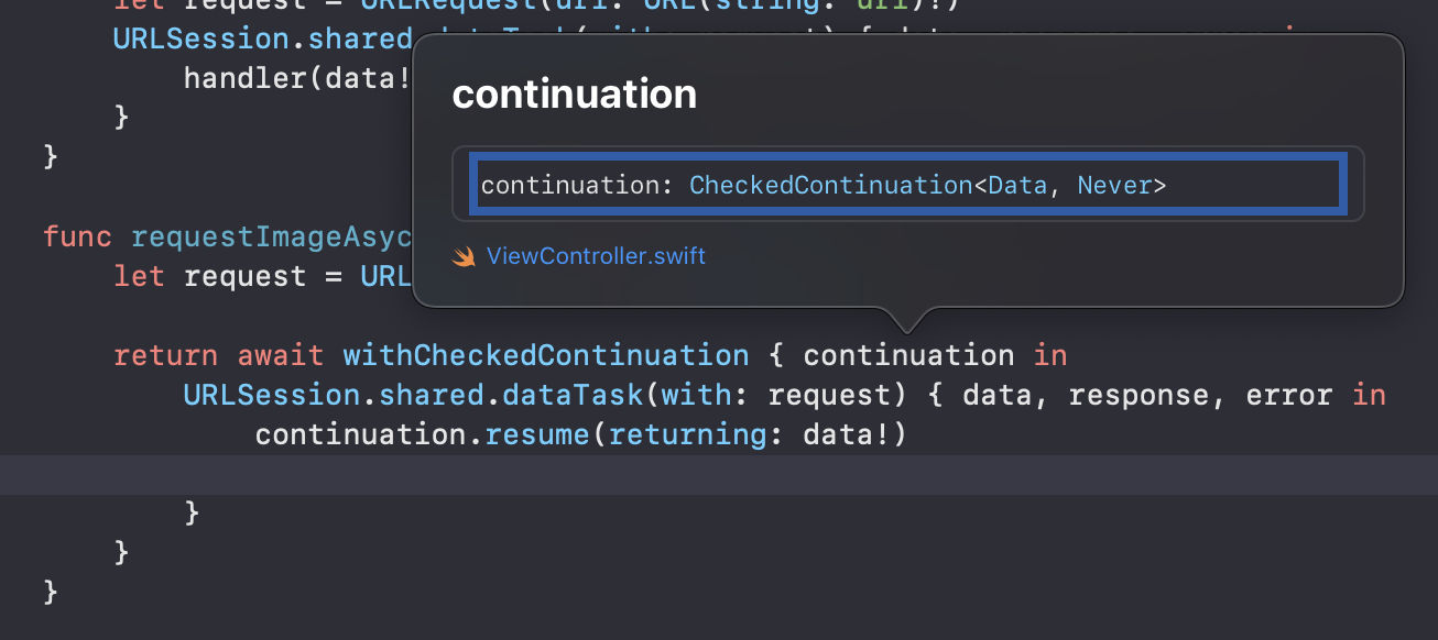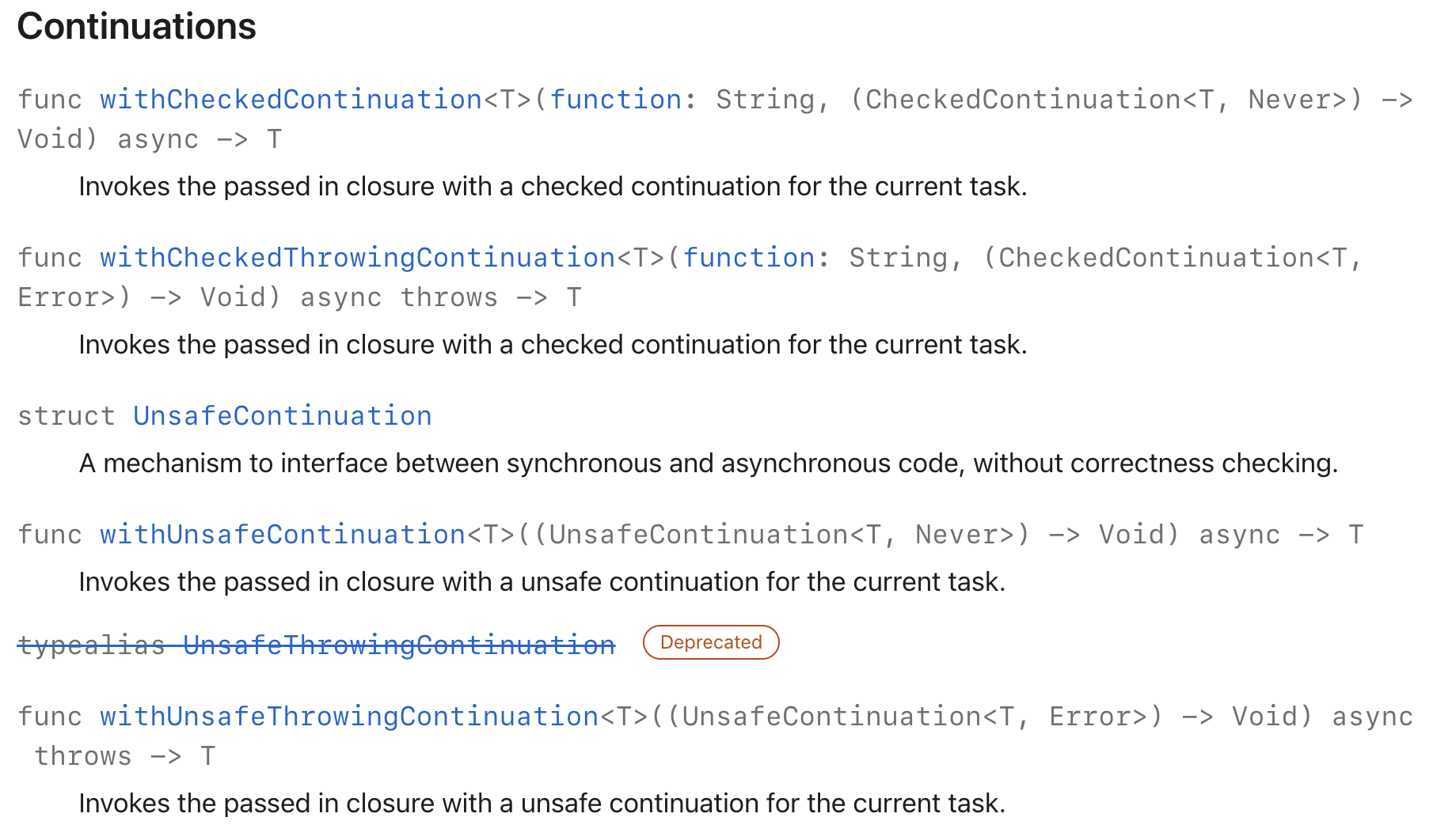 이러한 코드를 async await 문법으로 변경해 볼텐데 아래와 같이 CheckedContinuation을 사용하는 함수 withCheckedContinuation과 withCheckedThrowingContinuation이 존재하는데 차이점을 보면 이름처럼 error를 throw 할때는 withCheckedThrowingContinuation를 사용하는 것 같네요.