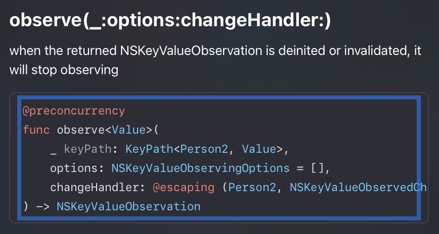 observe 매서드를 통해서 name의 변화를 관찰하고 변동 시에 작성해둔 print문이 실행되는 모습입니다. willSet 혹은 didSet과 유사한 역할을 수행할 수 있어 보입니다. observe 함수의 매개변수의 타입을 확인해 보면