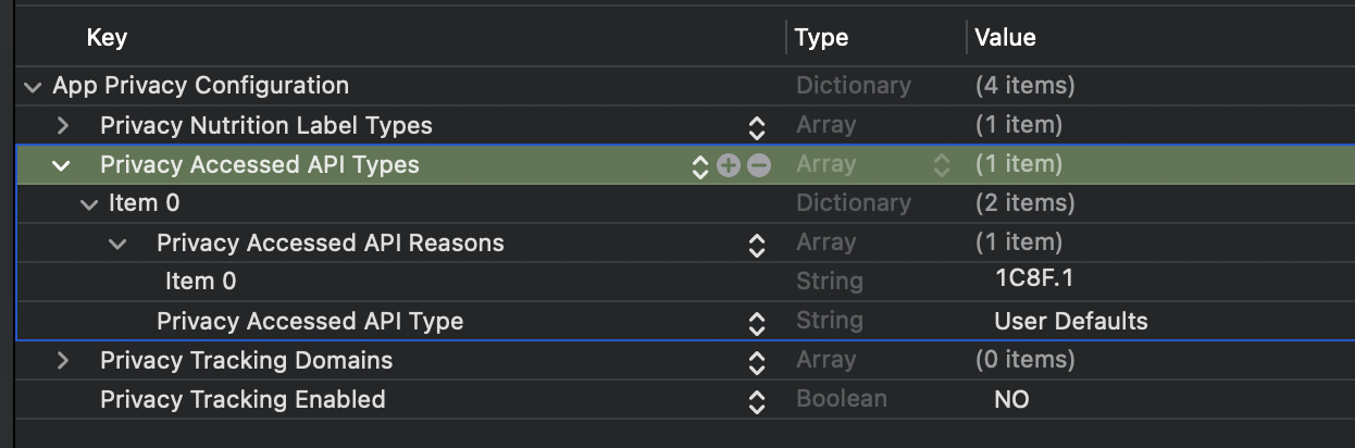 NSPrivacyAccessedAPITypes(Privacy Accessed API Types): 접근하는 API 타입을 나타냅니다. API 타입은 Required Reason API로 지정되어있습니다.