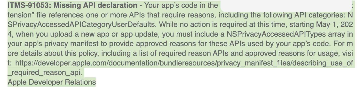 대략 privacy manifest를 포함해서 다음 버전에는 검수를 올리라는 내용입니다.