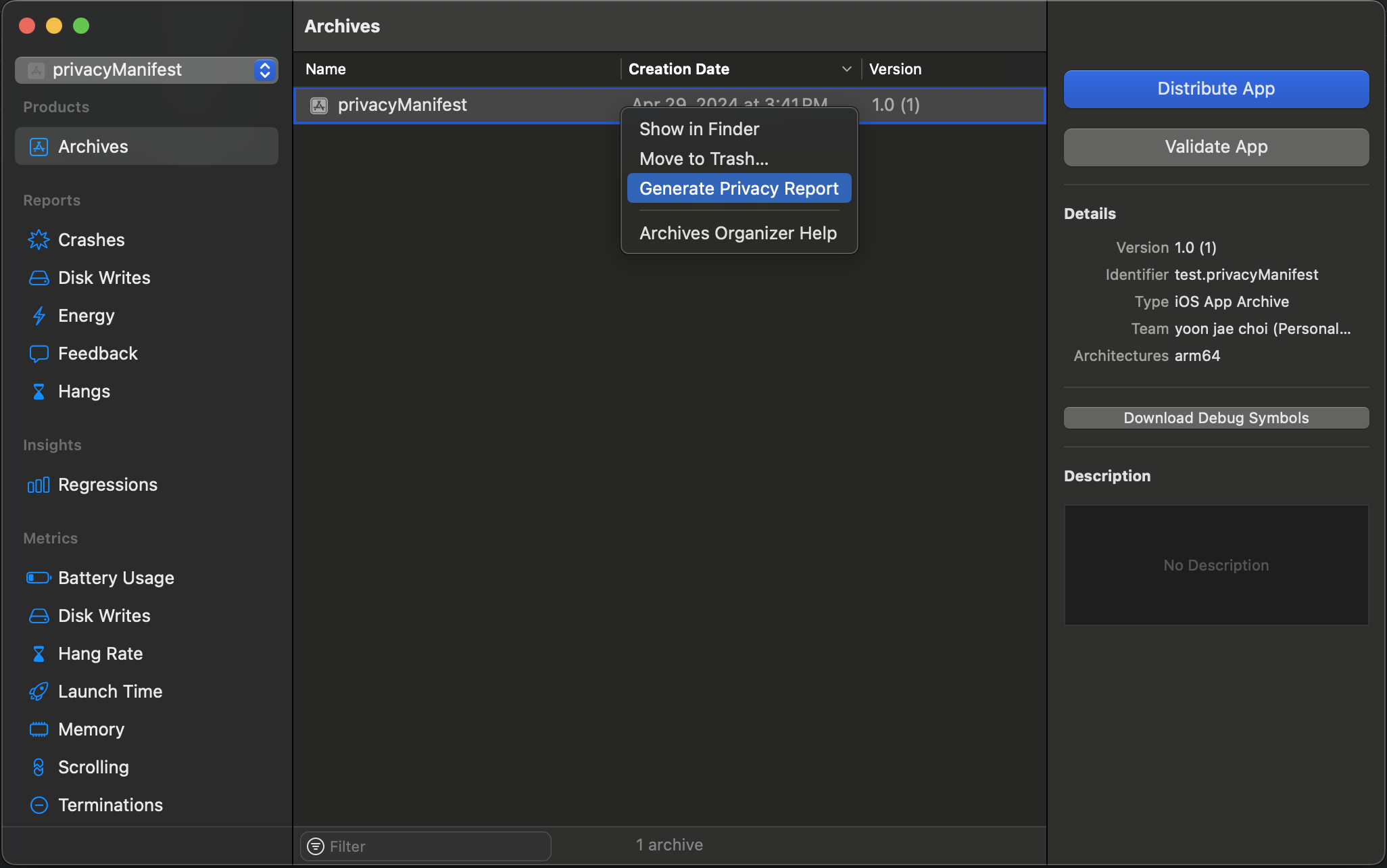 먼저 앱을 Archive 해주고 해당 파일에 오른쪽 클릭하여 Generate Privacy Report 를 클릭해 주면 아래와 같이 우리가 작성한 PrivacyInfo 파일이 pdf 형태로 다운로드 됩니다.