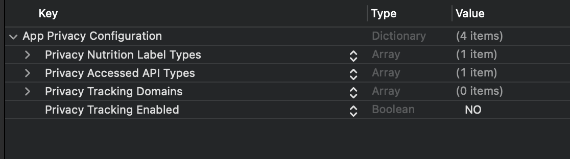 NSPrivacyTracking(Privacy Tracking Enabled): ATT(APP Tracking Transparency framework)에 대한 사용 여부를 나타내는 Bool 타입입니다.