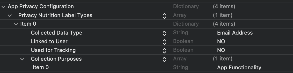 NSPrivacyCollectedDataTypes(Privacy Nutrition label Types): 수집하는 데이터 항목을 나타내며 명시할 데이터 항목은