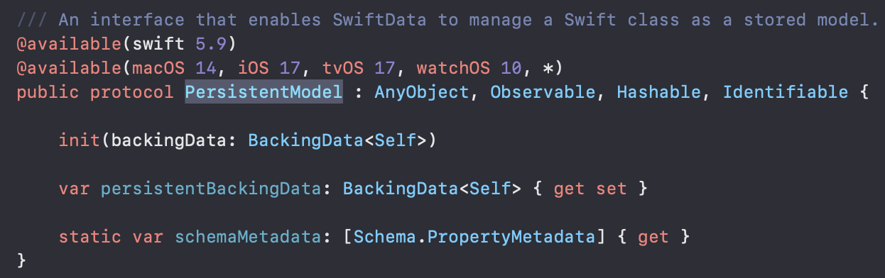 우선 다양한 Model의 CURD를 제공해주기 위해서 제네릭형태로 Repository를 구현을 하였습니다. 그러기 위해서 모델들의 공통적으로 가지고 있는 프로토콜 제약을 찾아보았고 PersistentModel이 SwiftDate의 인터페이스를 제공함을 확인할 수 있었습니다.